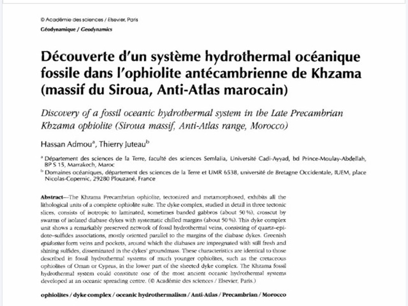 Découverte d'un système hydrothermal océanique fossile dans l'ophiolite antécambrienne de Khzama (massif du Siroua, Anti-Atlas marocain) Discovery of a fossil oceanic hydrothermal system in the Late Precambrian Khzama ophiolite (Siroua massif, Anti-Atlas range, Morocco) Hassan Admoua Département des sciences de la Terre, faculté des sciences Semlalia, Université Ca