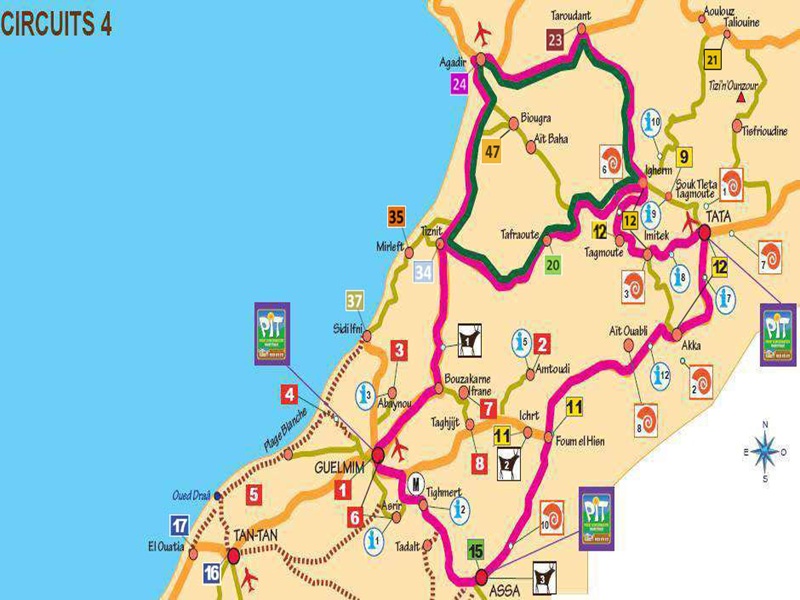 Circuits Sud de l'Anti-Atlas Pour simple Berline : Tiznit - Bou Izakarn - Guelmim - Taghjicht - Icht - Foum El Hisn - Akka - Tata - Issaffen ou Tagmout - Igherm - Tafraout - Tiznit - Agadir Avec 4x4 : Plage Blanche - Oued Draa - Tan Tan HISTOIRE E
